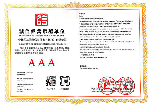 中保國衛(wèi)國際保安服務(wù)(北京)有限公司,屬中保國衛(wèi)集團(tuán)旗下子公司。能全方位的為大型客戶提供優(yōu)質(zhì)的安保、押運服務(wù),是集人防和技防于一體的新型正規(guī)化綜合安保押運服務(wù)企業(yè),提供人防、物防、技防、聯(lián)網(wǎng)報*、非武裝押運等安防相關(guān)的一站式服務(wù)。 公司在國內(nèi)多省設(shè)立有分公司及分支機構(gòu),著重提升安全押運、智能技術(shù)押運及安全技術(shù)防范相關(guān)的服務(wù),業(yè)務(wù)范圍覆蓋全國一、二線城市、港澳地區(qū)以及海外地區(qū)。安保方面主要為政府機構(gòu)、金融機構(gòu)、企事業(yè)單位、醫(yī)療衛(wèi)生、高等院校、工業(yè)園區(qū)、大型商場、高檔住宅、智能商務(wù)樓、大型活動提供門衛(wèi)、守護(hù)、巡邏、押運(非武裝)、安全檢查、保安特勤、私人護(hù)衛(wèi)、消防中控、安全技術(shù)防范、遠(yuǎn)洋護(hù)航等全方位服務(wù),同時面向國際市場,為中資企業(yè)在“一帶一路”沿線國家投資提供境外安保服務(wù)。 >> 更多內(nèi)容 |